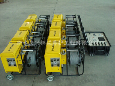 公司現(xiàn)有各種規(guī)格液壓千斤頂560余臺,隨時(shí)進(jìn)場備用PLC同步頂升系統(tǒng)分為5個(gè)部分:液壓泵站、PLC計(jì)算機(jī)控制系統(tǒng)、液壓終端、位移壓力檢測與人機(jī)界面操作系統(tǒng)。該系統(tǒng)是將液壓頂升系統(tǒng)、計(jì)算機(jī)PLC信號處理、位移監(jiān)控與橋梁結(jié)構(gòu)分析和施工技術(shù)進(jìn)行集成,并在集成系統(tǒng)上進(jìn)行的成套技術(shù)開發(fā)。其核心是在橋梁機(jī)構(gòu)分析與施工技術(shù)總結(jié)的基礎(chǔ)上,根據(jù)橋梁特性設(shè)計(jì)計(jì)算機(jī)PLC信號處理與液壓系統(tǒng),輸入外部監(jiān)控設(shè)施的位移信號,輸出液壓系統(tǒng)油量控制信息,利用終端多組超薄型千斤頂來達(dá)到平衡、安全與高效的橋梁頂升的目的,其頂升和降落精度誤差不超過±0.5mm,頂升載荷包括:50噸-1000噸,頂升高度為10mm到500mm1、高速置零、低速頂升,升降速度可以任意控制。 2、液壓千斤頂內(nèi)置式(或外置)位移、壓力傳感器、均載閥,保證了頂升系統(tǒng)在惡劣工作環(huán)境下的高可靠性。 3、均載閥的過載保護(hù)功能,避免了多缸頂升時(shí)常見的脹缸事故。 4、先進(jìn)的進(jìn)油調(diào)速和重載先降液壓回路,不單是頂升時(shí)達(dá)到高精度同步,在帶載下降時(shí)同樣可保證高精度同步。 5、操作簡便直觀,并可實(shí)現(xiàn)工作的側(cè)滾、俯仰等姿態(tài)的調(diào)整。 6、可以掛接彩色觸摸屏,實(shí)時(shí)在線顯示頂升位移和頂升載荷,也可掛接工控機(jī)實(shí)時(shí)記錄施工全過程。 7、可以擴(kuò)展至32點(diǎn)或32點(diǎn)以上的多點(diǎn)同步,在多點(diǎn)多步工作狀態(tài)下,除保持多點(diǎn)位置的同步外,并可按用戶的要求調(diào)節(jié)各支點(diǎn)的載荷分布。